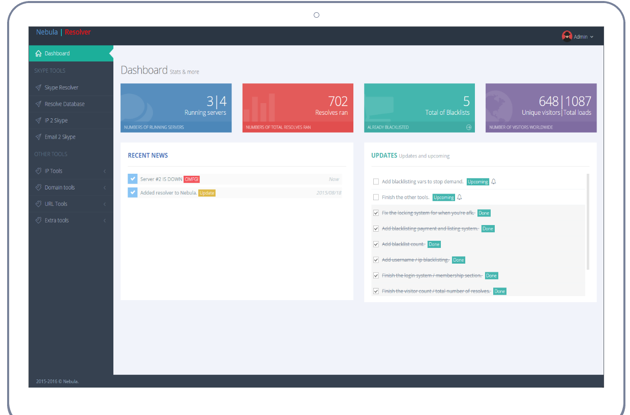 Our resolver contains a lot of features. Including some tools for Blacklisting, skype resolving, resolve database, ip 2 skype, email 2 skype, Ping a site or IP, IP 2 host, Host 2 IP, IP validator, Geo IP locator, Whois checker, is it down or up?, Get website headers, URL shortener, URL Shorttener Bypass, Email Validator External and Phone number Checker.